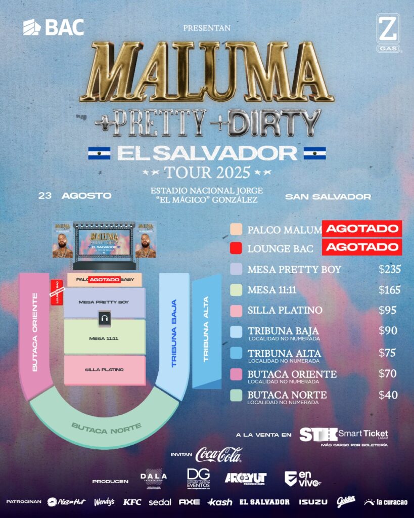 El artista colombiano “Maluma”, se presentará en El Salvador este 23 de agosto, dando un concierto como parte de su gira este año, denominada Tour 2025 +Pretty+Dirte.